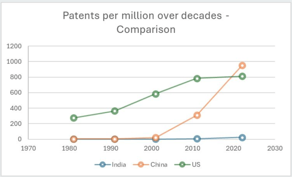 India’s patent grant rate in 2022 stood at a modest 27 patents per million population, significantly lower compared to other emerging economies. This indicates a bottleneck in the process of patent acquisition, which is crucial for protecting intellectual property and fostering innovation.