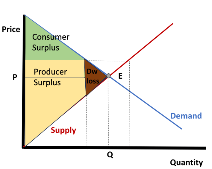 As compared to a free market scenario, these price control interventions and consequent price distortions eventually lead to disruptions to both consumer and producer surplus, since they introduce a “deadweight loss” to society. Deadweight loss is like a loss of potential value that neither consumers nor producers benefit from, and it ultimately reduces overall economic welfare.